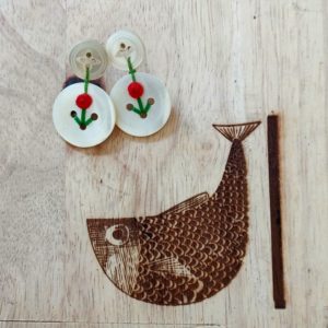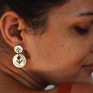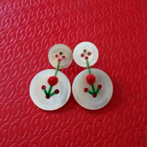 Aretes confeccionados con botones antiguos de nácar y decorados con un detalle de flor roja que crea el contraste perfecto entre la antigüedad del botón y su nueva forma de vida útil.