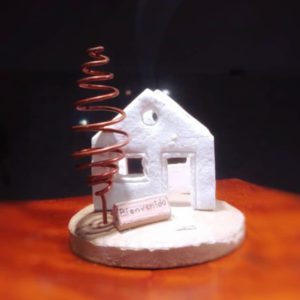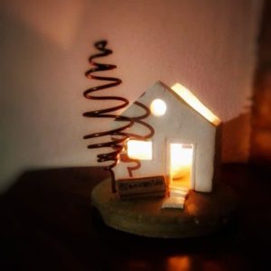 Casitas elaboradas en pasta piedra y cemento, con detalles en alambre y otros materiales. Puede usarse para distintas finalidades. Medidas: 9x10cm