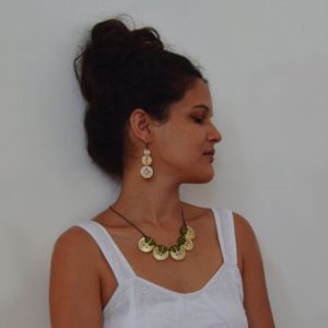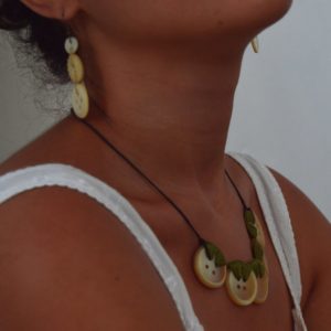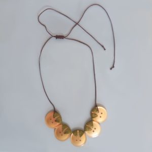 Collares confeccionados con botones reciclados. Es una forma diferente de pensar el concepto de botón, pues el objeto es reutilizado a modo de cuenta. Cada uno tiene su historia. Este está inspirado en la manera en que crecen las hojas en los árboles.
