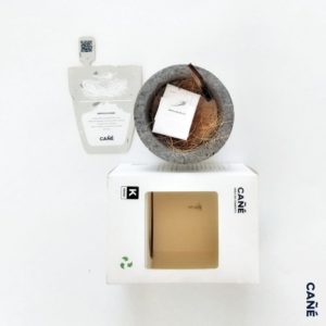 Kit de siembra con maceta de concreto artesanal con plásticos y tintas CMYK reciclados de producciones gráficas más sustrato orgánico, fibras naturales, semillas, mini herramienta para siembra y marcado de la planta e instrucciones de siembra y cuidado.