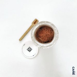 Maceta de concreto artesanal con plásticos y tintas CMYK reciclados de producciones gráficas. Incluye mini herramienta para siembra y el marcado de la planta.